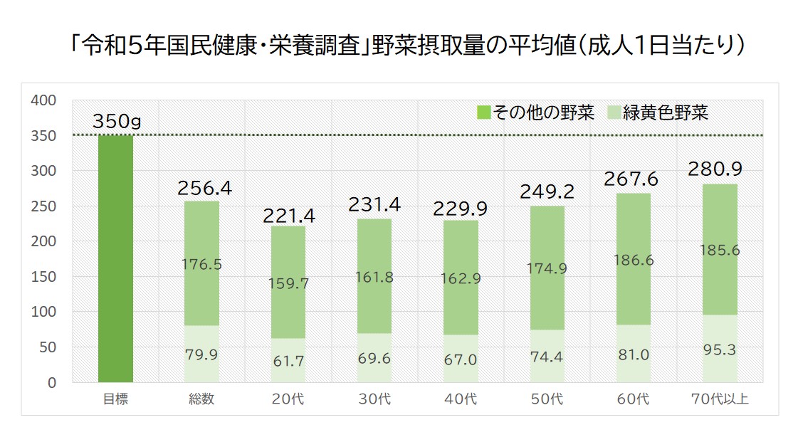 日本人の平均摂取量は過去最低の250gですので、目標値に100g足りていない状況です。